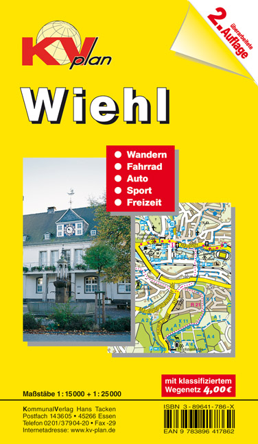 Die Stadtplanseite im Maßstab 1:15.000 mit Straßenverzeichnis zeigt alle Details der Ortsteile. Von öffentlichen Gebäuden über Bildungs- und Sozialeinrichtungen bis zu Sport- und Freizeitangebote reicht die umfassende Symbollegende. Die Freizeitkartenseite im Maßstab 1:25.000 stellt die gesamte Wanderregion um Wiehl herum dar. Sie reicht von Engelskirchen bis Nümbrecht und Much. Vom Haupt- und Bezirkswanderweg über örtliche und Rundwanderwege bis zum Trimm- und Waldlehrpfad reichen die verschieden Wanderwegsignaturen. Zum Radwandern sind Fernradwanderwege und Radrundwanderwege aufgenommen.